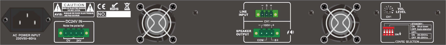 - Salida a 8 ohms o línea 100V.