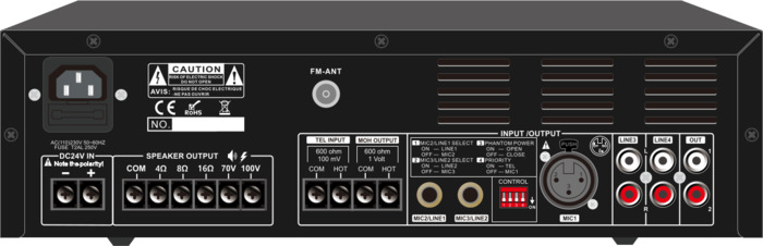 - Salidas a 4, 8, 16 ohms, línea 70-100V.