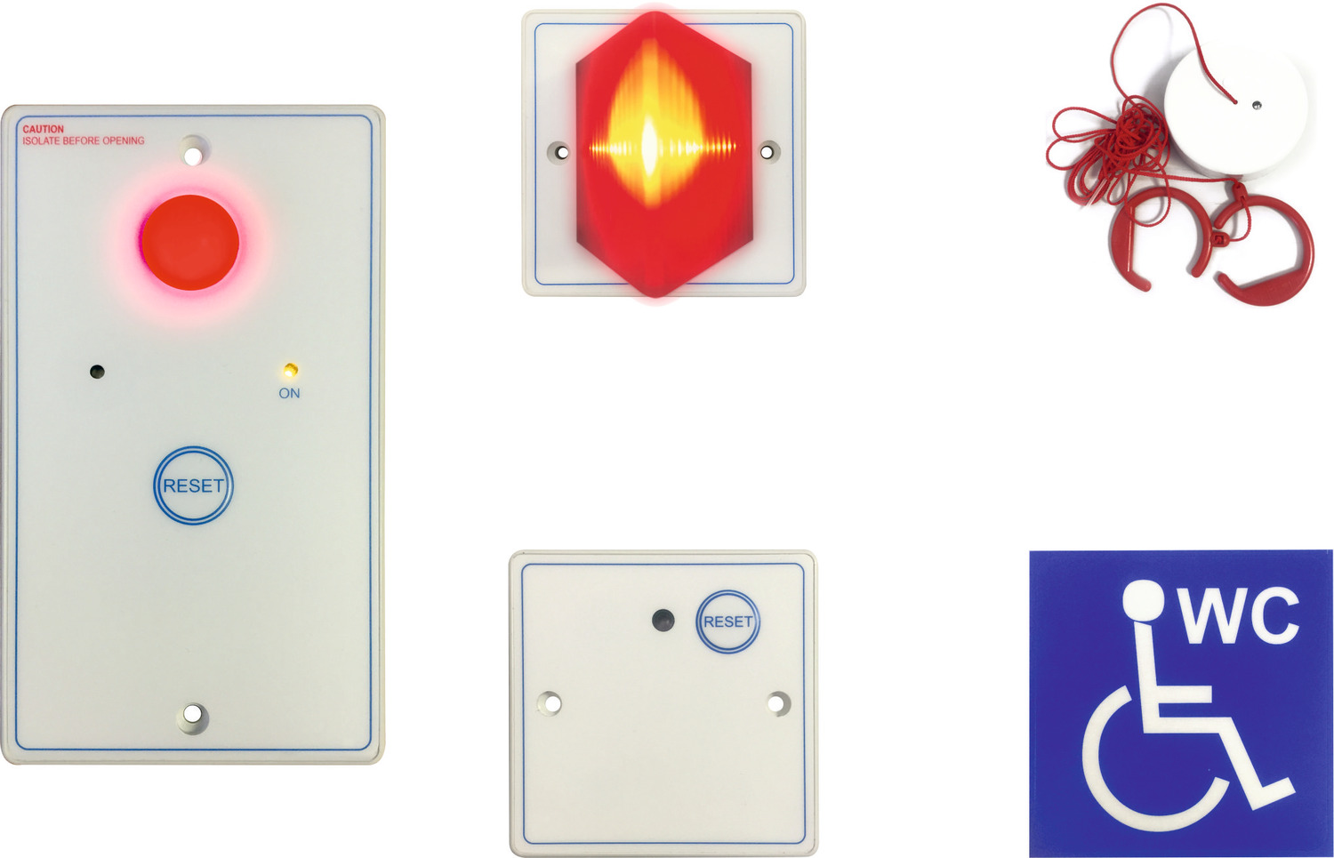 - El kit de alarma para aseos accesibles y cabinas de vestuarios accesibles ha sido diseñado para disponer de un sistema fiable y fácil de usar con el que un usuario pueda transmitir una llamada de asistencia perceptible desde un punto de control y que permite al usuario verificar que su llamada ha sido recibida, o perceptible desde un paso frecuente de personas.