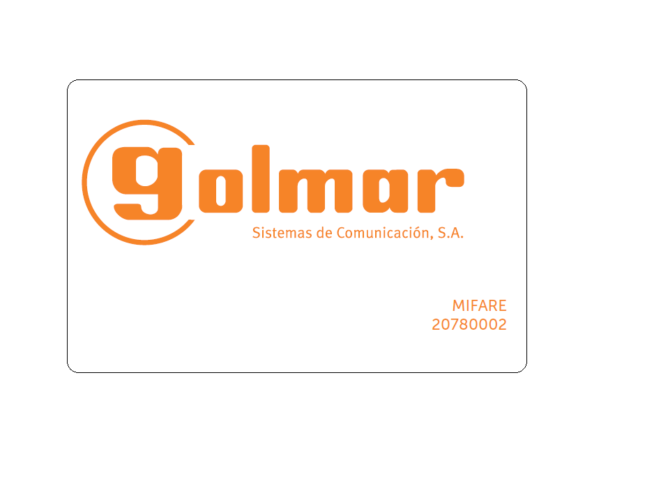 - Tarjeta tipo MIFARE Standard 1K con logo GOLMAR en color naranja serigrafiado.