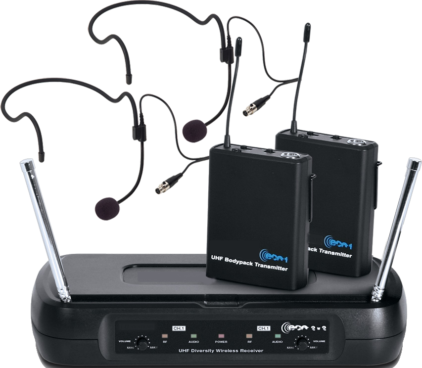 - Kit con 2 petacas y micrófonos diadema y receptor UHF de 2 canales.