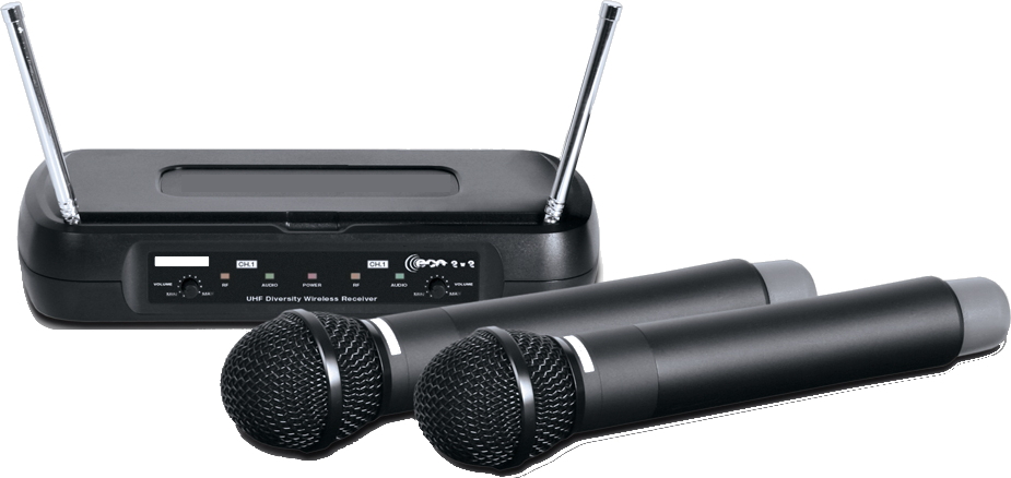 - Kit con 2 micrófonos mano y receptor UHF de 2 canales.